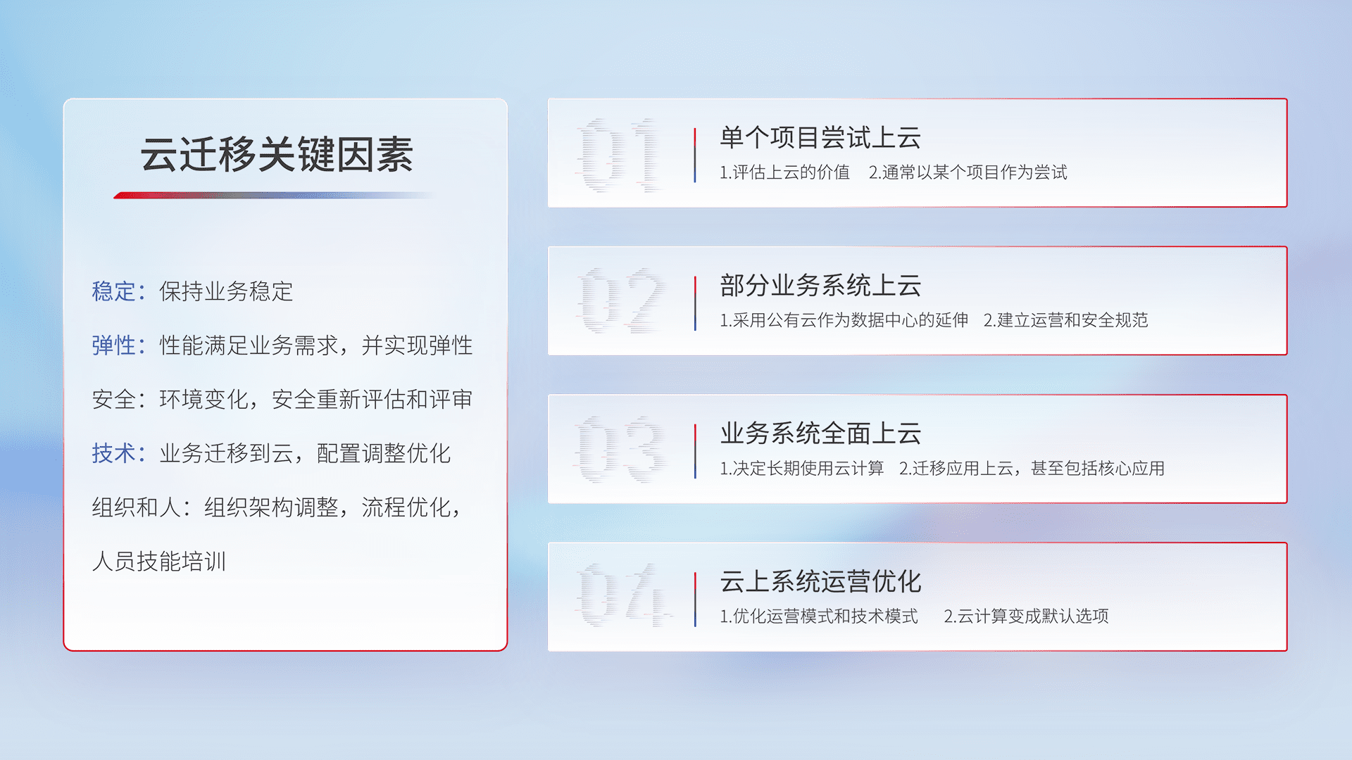 结合实际业务,,,,从规划设计、、、、云平台选型、、云原生改造、、、数据迁移、、集成交付,,,,迁移全过程为客户识别最佳上云路径,,,做好风险识别管理,,,,设计网络架构、、、、身份权限、、、安全审计合规、、操作审计、、、日志审计、、监控告警策略、、多站点容灾设计等,,,,对云上基础设施进行整体规划,,,,提升IT治理水平,,,,以满足弹性、、、、高可用、、、高性能的需求。。。。