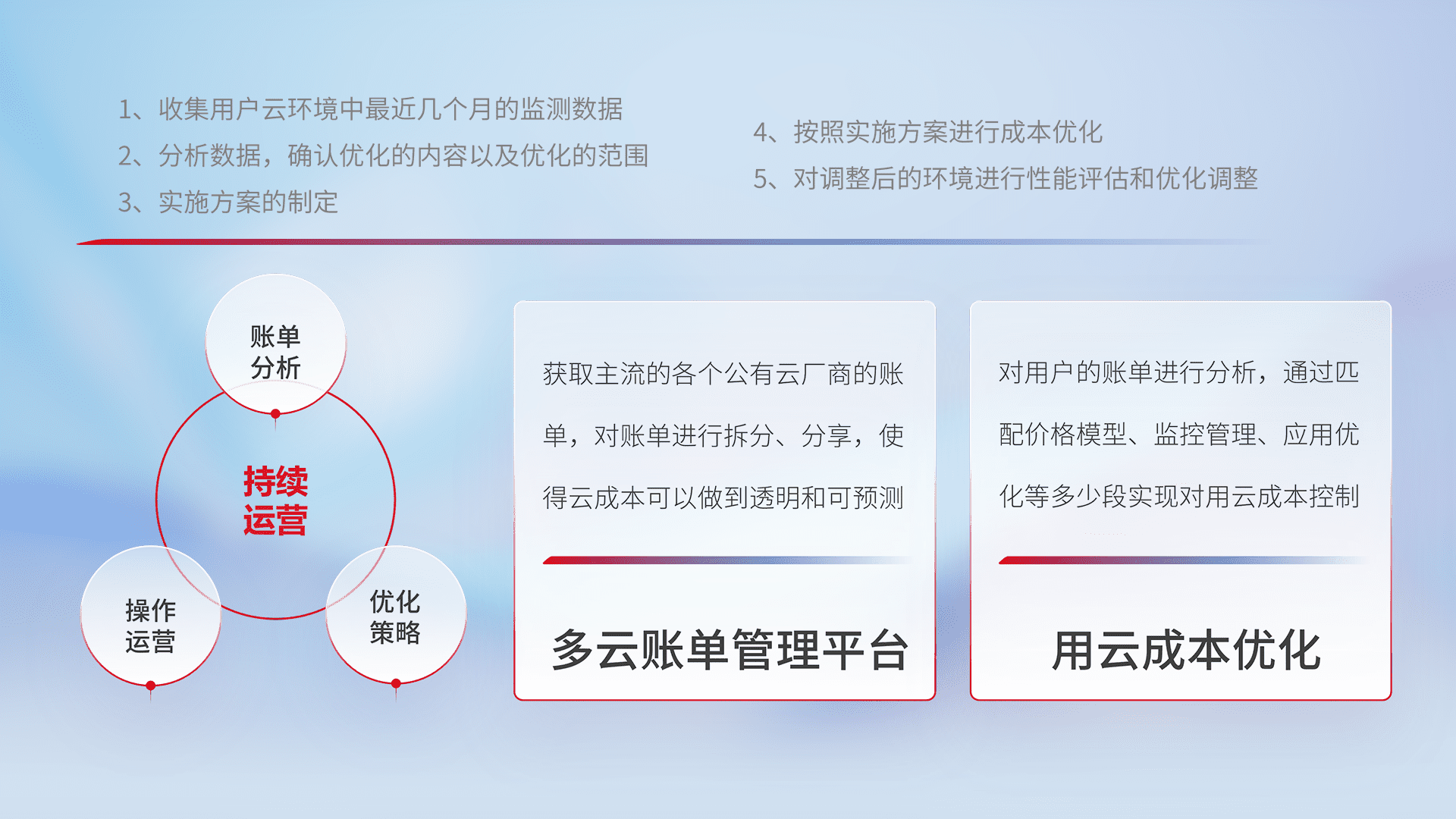通过多云纳管,,以统一的资源数据模型把客户的云资源进行抽象和封装,,,进而实现对多云资源的统一操作,,保障云资源管理的可靠性、、、、稳定性与可用性。。。量身定制化运维内容,,,,配置、、、、开发运维、、、补丁管理、、、、备份、、监控、、、、认证和访问管理、、审计和日常巡检等,,,,保障在用云过程中的可靠度,,稳定度以及高可用率。。。